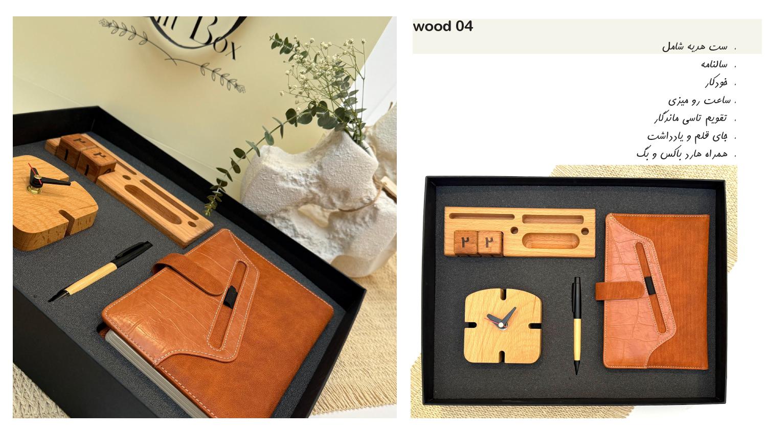 با ست هدیه چوبی 1405 آداک کد 004، یک هدیه خاص و ماندگار به عزیزانتان هدیه دهید. این ست با امکان حکاکی اسم و لوگو، یک انتخاب منحصربهفرد برای مناسبتهای ویژه است. طراحی زیبا و کیفیت بالا، جذابیت این هدیه را دوچندان کرده و آن را به یک انتخاب ایدهآل برای هر سلیقهای تبدیل میکند.